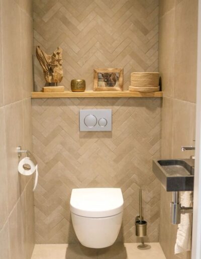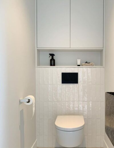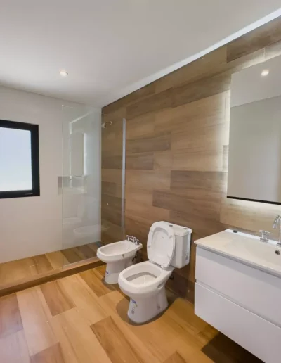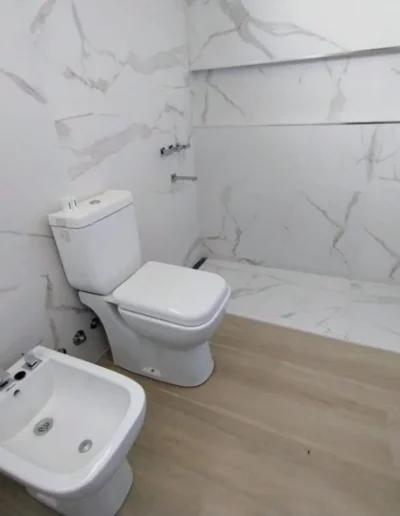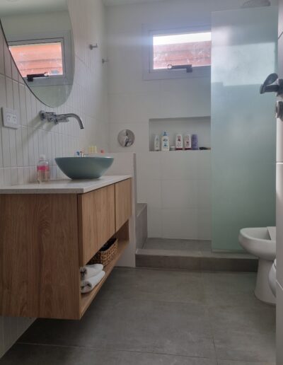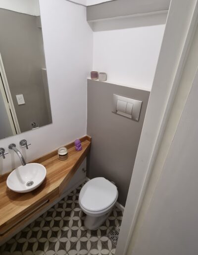 Para no reducir el espacio se utilizo un inodoro corto con un depósito de embutir dual. Arriba un estante para decorar y poner alguna que otra planta.