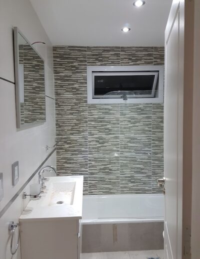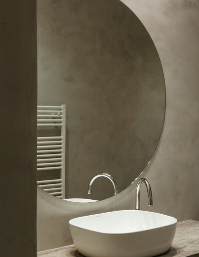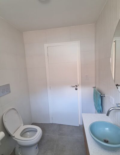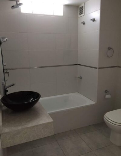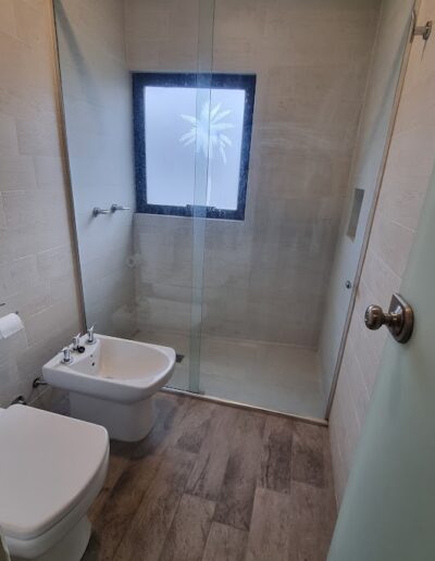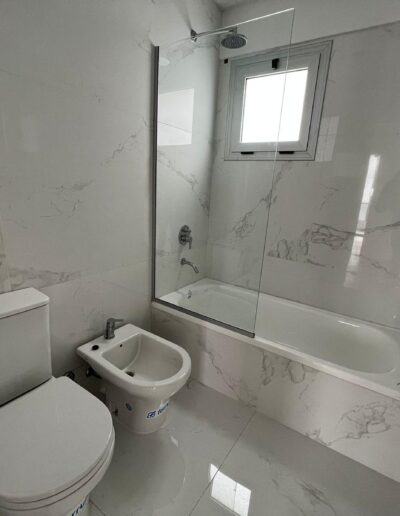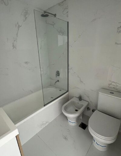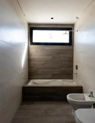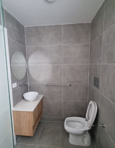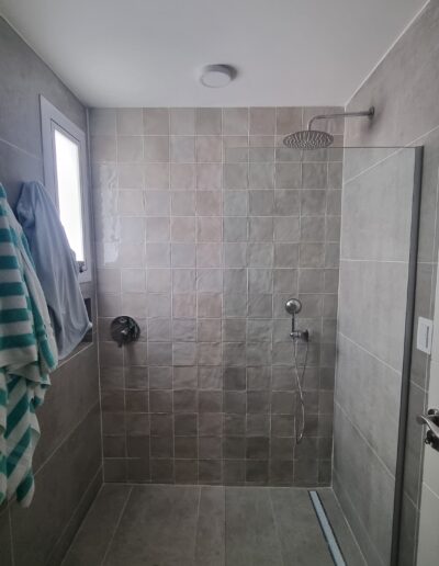 El baño principal totalmente revestido con porcelanato gris cemento. Piezas grandes en un baño pequeño para minimizar las juntas.