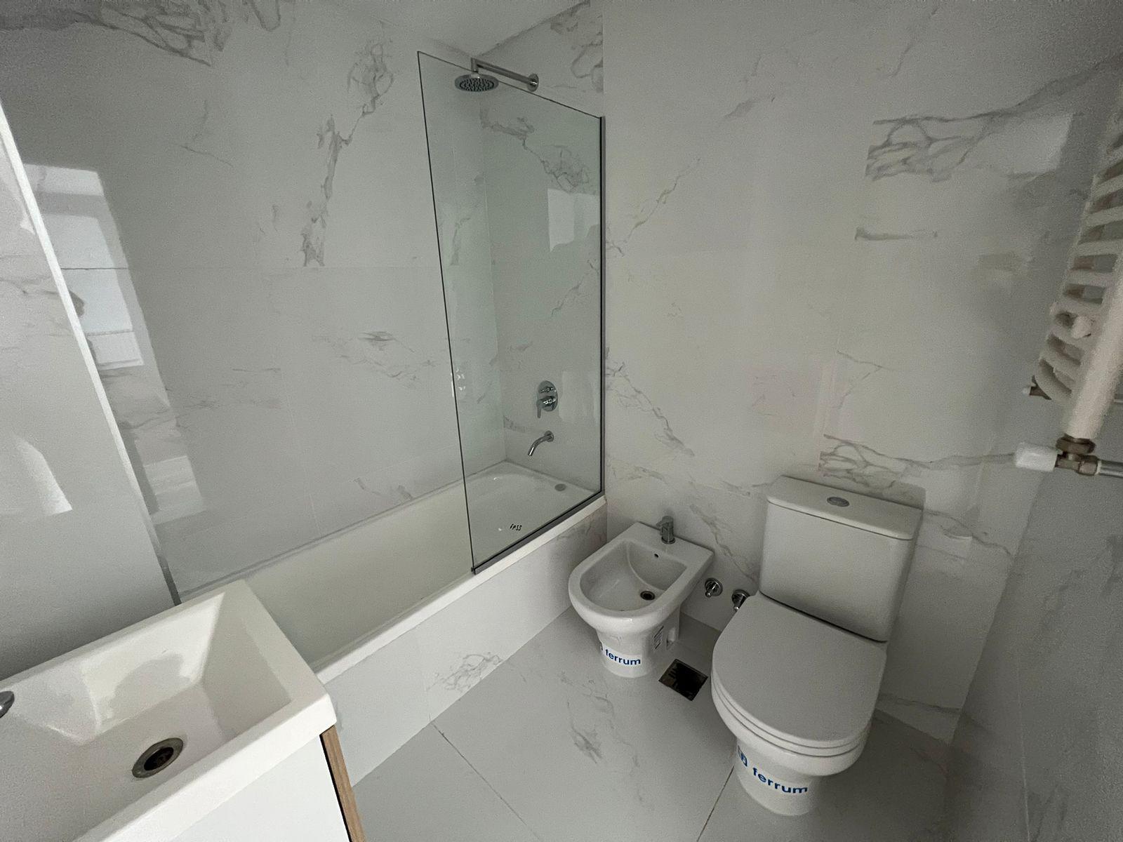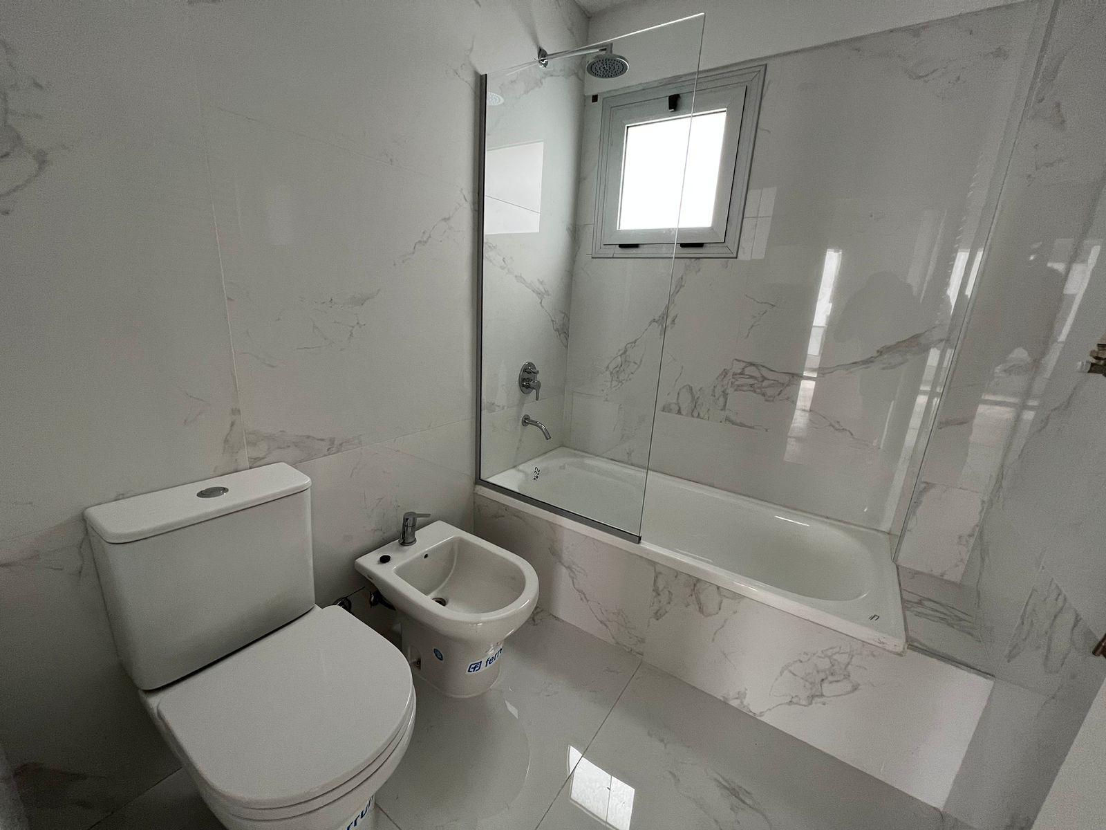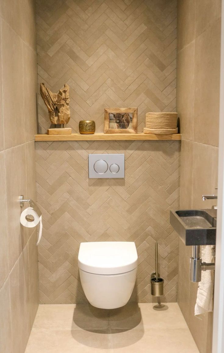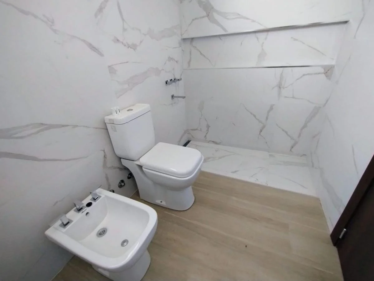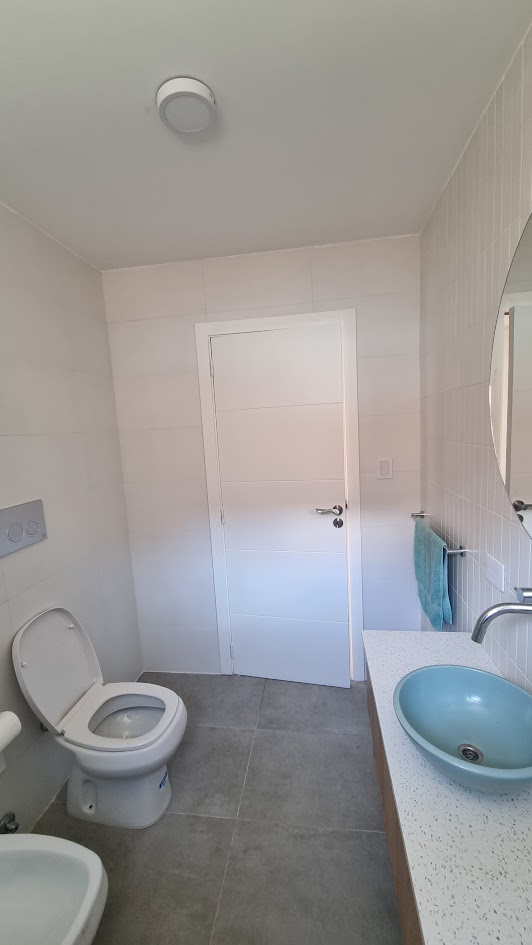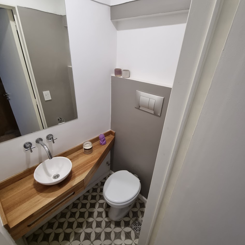Para no reducir el espacio se utilizo un inodoro corto con un depósito de embutir dual. Arriba un estante para decorar y poner alguna que otra planta.
