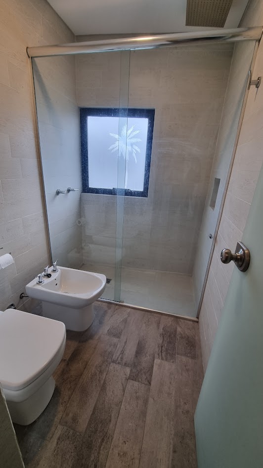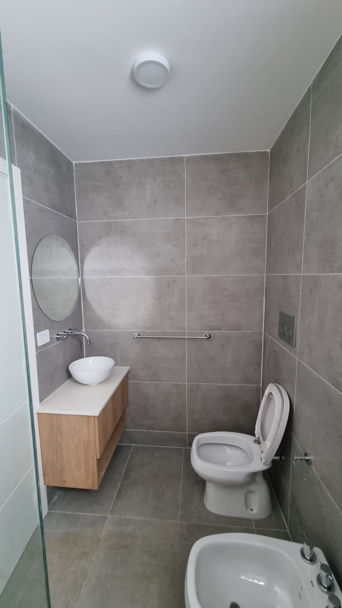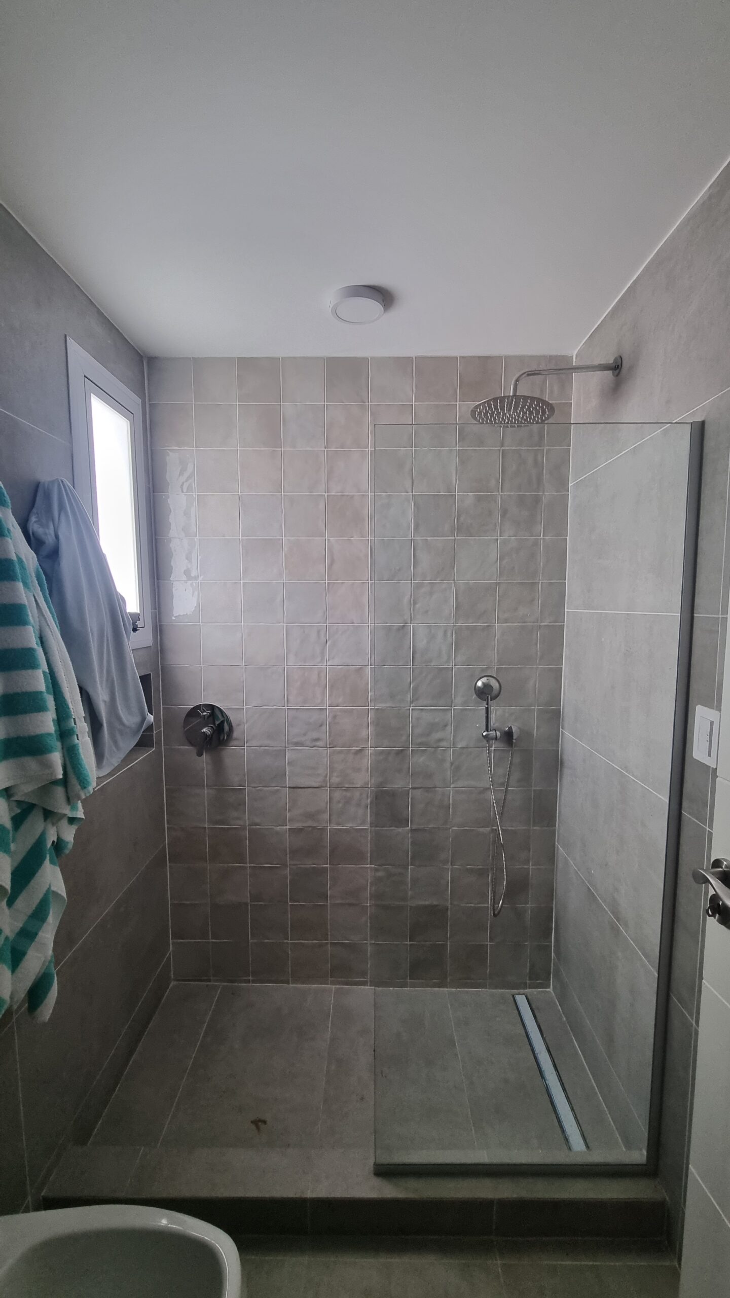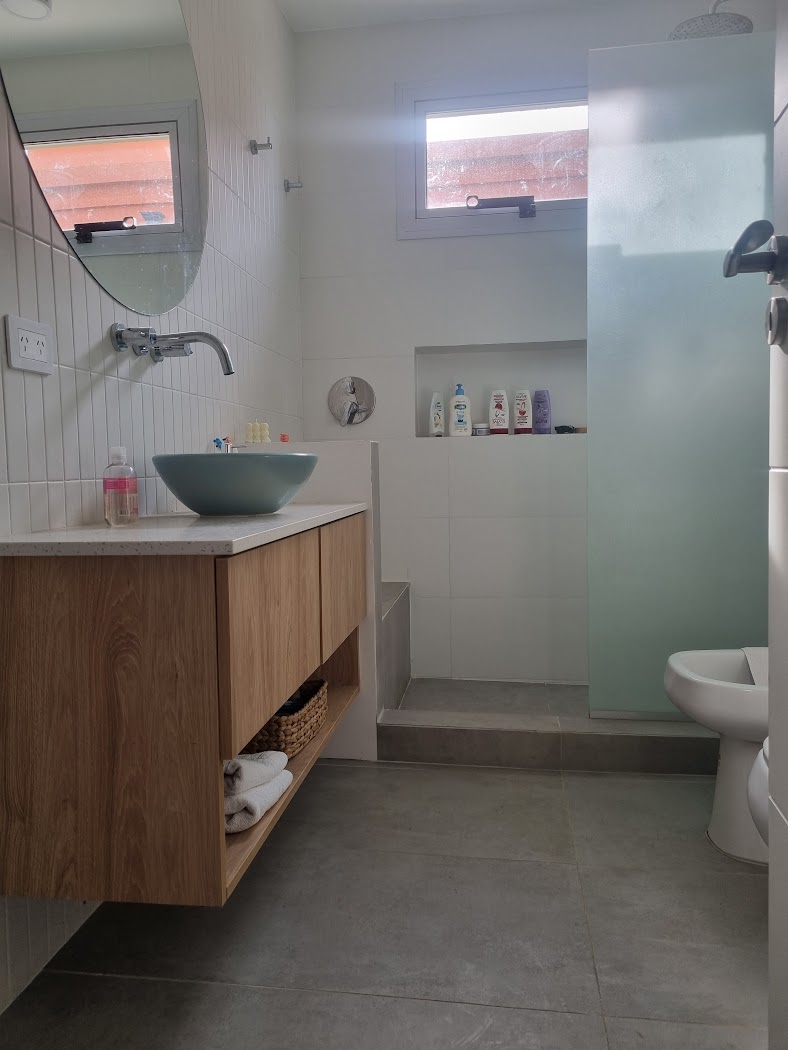 El baño principal totalmente revestido con porcelanato gris cemento. Piezas grandes en un baño pequeño para minimizar las juntas.