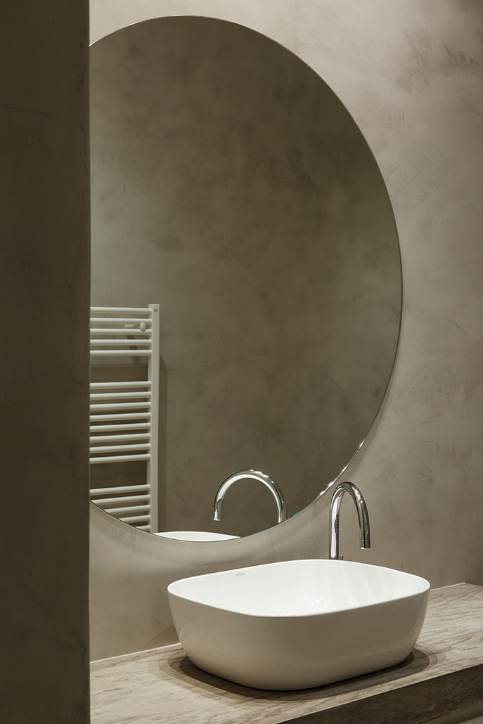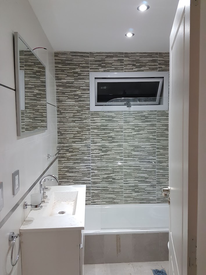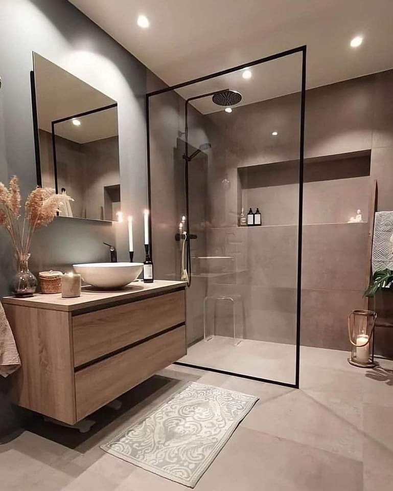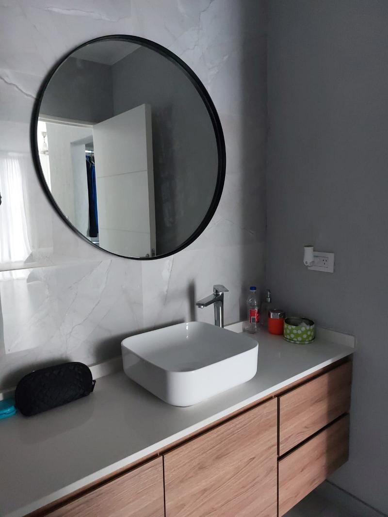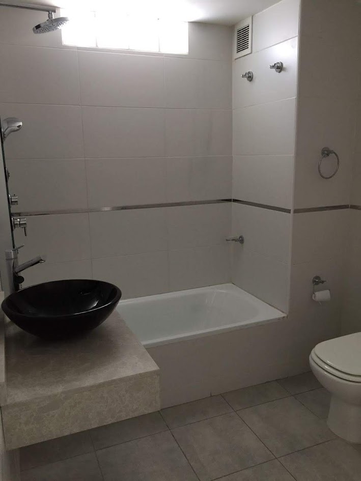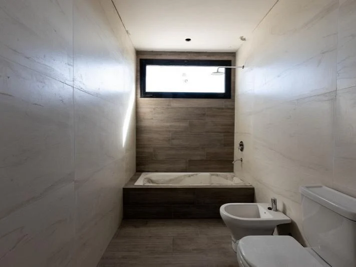 El baño principal totalmente revestido con porcelanato gris cemento. Piezas grandes en un baño pequeño para minimizar las juntas.
