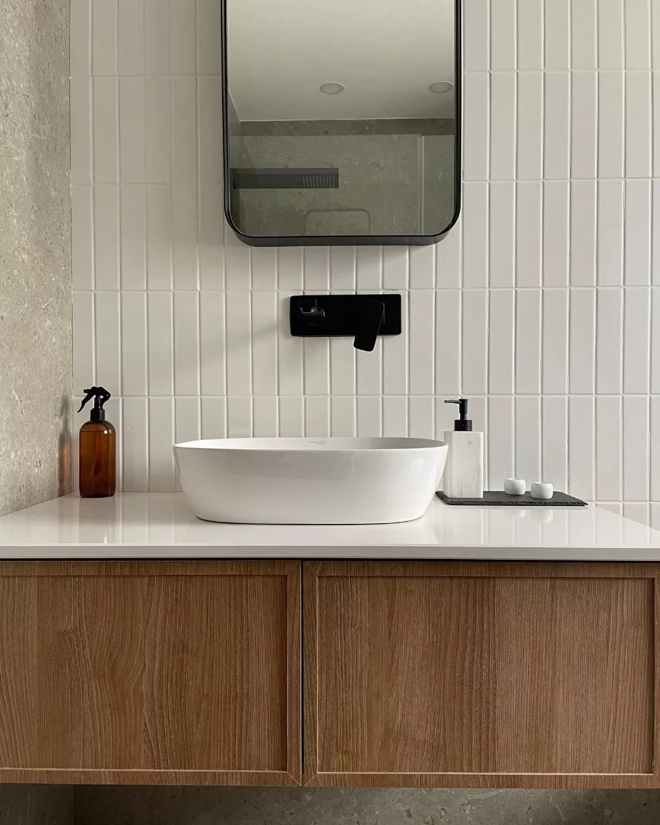 Lo acompañamos con una mesada y estantes en paraiso y una grifería simple de pared.